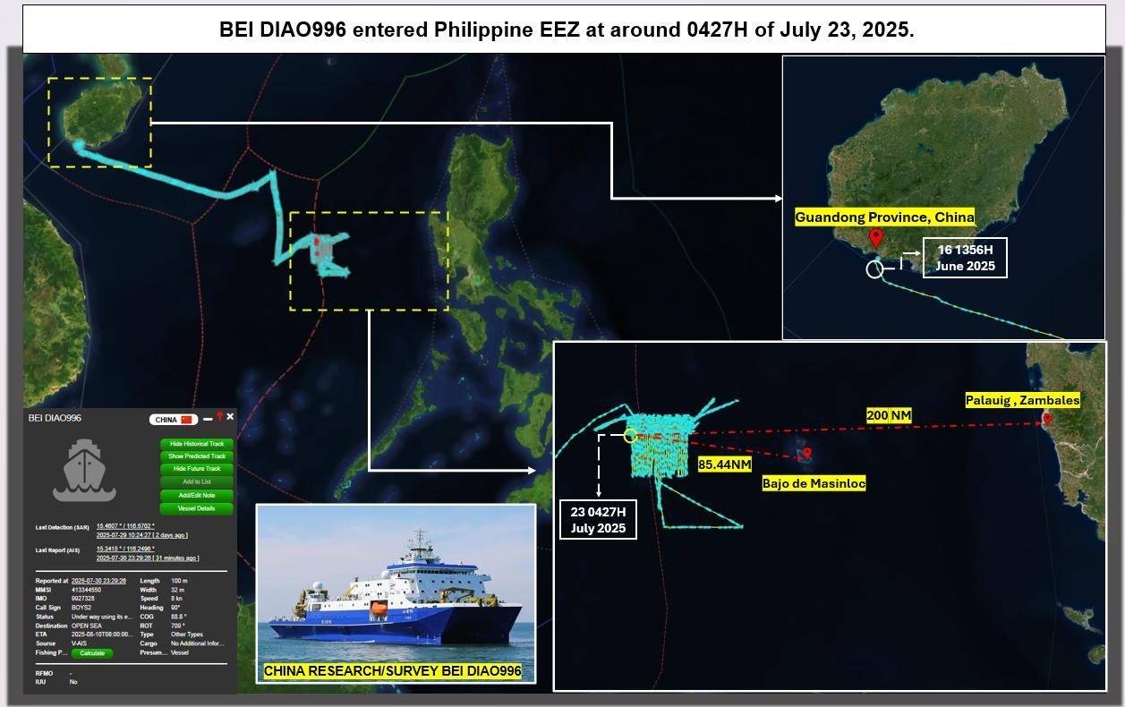 Bei Diao 996 was seen operating some 343 km (185 nautical miles) off Zambales and appeared to be conducting marine scientific research (MSR) about 74 km (40 nautical miles) west of Bajo de Masinloc.