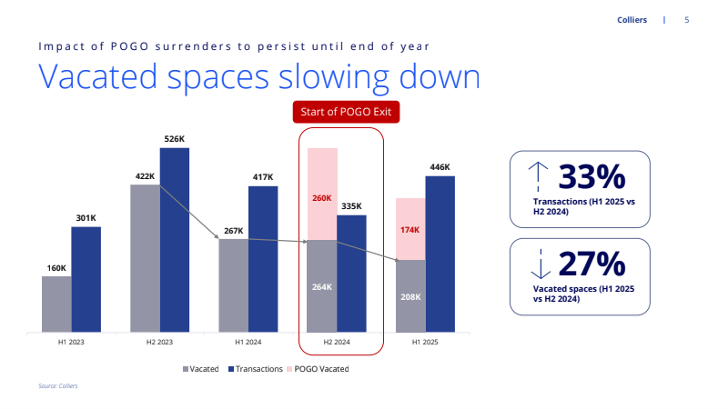 Kevin Jara, director and head of Office Services-Tenant Representation at Colliers, reported that transactions in the first half of 2025 grew 33 percent to 446,000 sqm from a year ago.