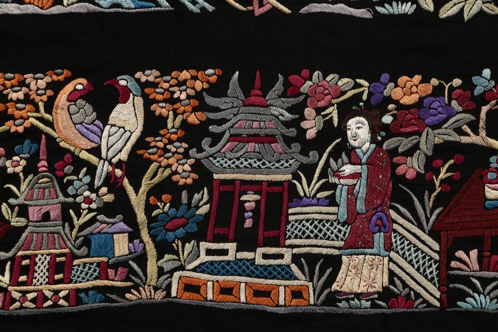 Many late 19th century examples feature floral designs, each petal worked in varying patterns and textures. Others show Chinese motifs like pagodas and lotus blossoms that echoed the European craze for chinoiserie, a fascination with the so-called “Orient” that Edward Said would later critique as Orientalism. Unlike imagined fantasies, though, these motifs marked real trade routes and exchanges across Asia.