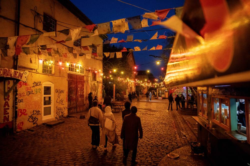 (FILES) Pedestrians walk along stalls in Pusher Street in the Freetown Christiania, Copenhagen, Denmark on November 22, 2023. A former hippie haven recently associated with the violence of the drug trade, the libertarian enclave of Christiania, in the heart of Copenhagen, is making a clean sweep by demolishing +Pusher Street+, its main thoroughfare where cannabis was available for sale, on April 6, 2024. (Photo by Mads Claus Rasmussen / Ritzau Scanpix / AFP)