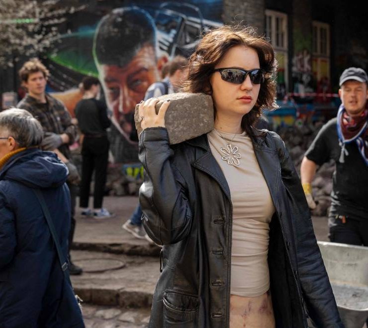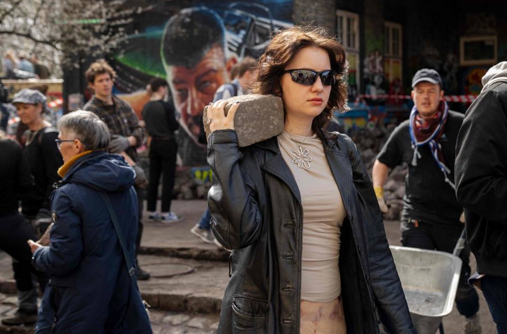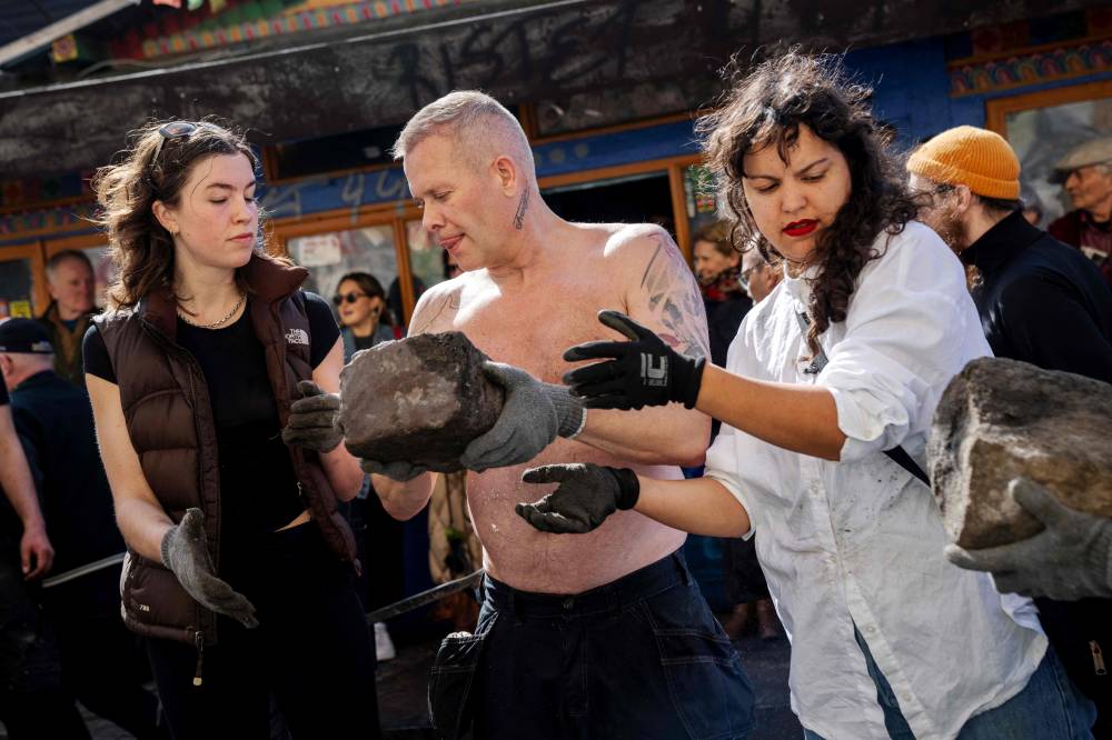A participant carries a cobblestone as residents of the Christiania neighbourhood jointly dig up the stones at Pusher Street, in Copenhagen, Denmark, on April 6, 2024, to officially mark the closure of the street. Copenhagen's libertarian Christiana neighbourhood, an old hippie paradise tainted in recent years by drug trafficking violence, is clearing out its famous Pusher Street, where cannabis used to be sold freely. In late August, the so-called Christianite residents decided to close the street, known for its hashish stalls, after the fourth murder in three years shattered the image of a free-spirited and peaceful community. (Photo by Ida Marie Odgaard / Ritzau Scanpix / AFP)