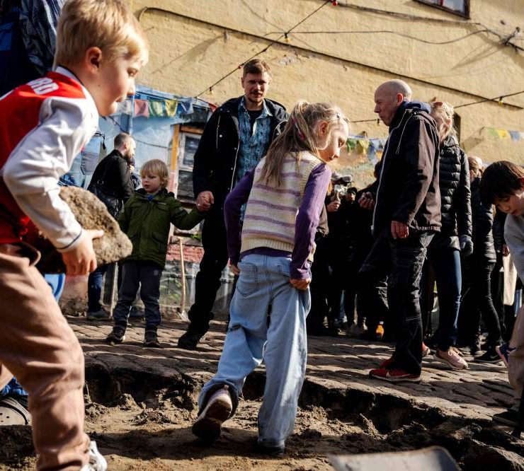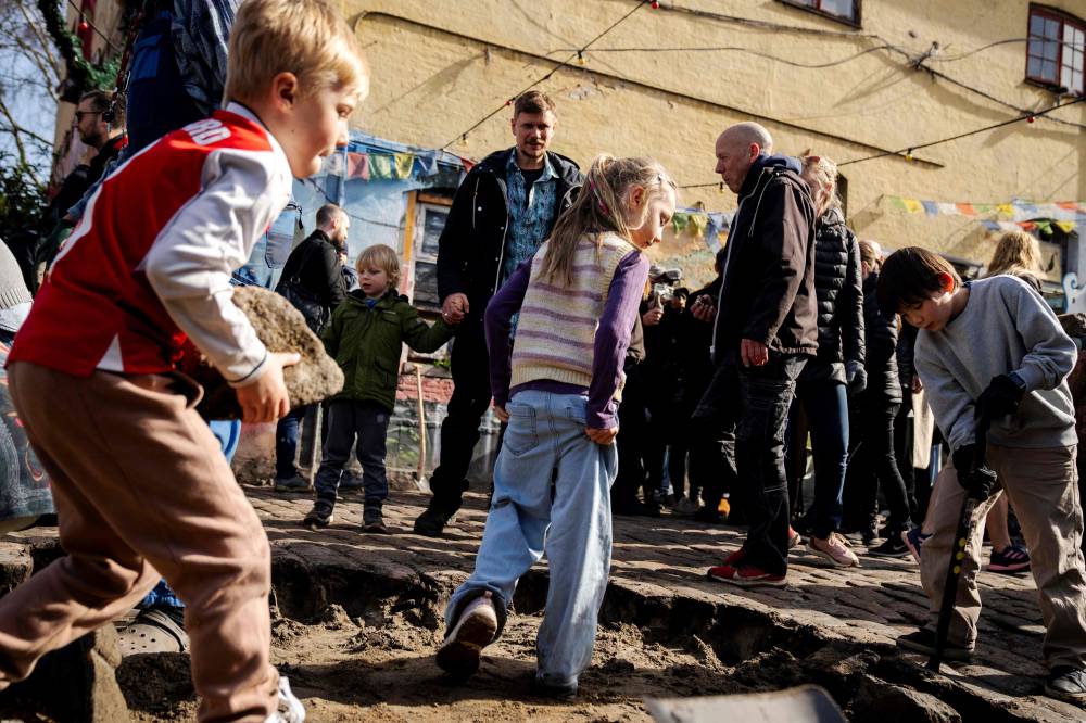 Children participate as residents of the Christiania neighbourhood jointly dig up the cobblestones at Pusher Street, in Copenhagen, Denmark, on April 6, 2024, to officially mark the closure of the street. Copenhagen's libertarian Christiana neighbourhood, an old hippie paradise tainted in recent years by drug trafficking violence, is clearing out its famous Pusher Street, where cannabis used to be sold freely. In late August, the so-called Christianite residents decided to close the street, known for its hashish stalls, after the fourth murder in three years shattered the image of a free-spirited and peaceful community. (Photo by Ida Marie Odgaard / Ritzau Scanpix / AFP)