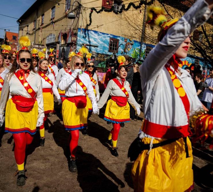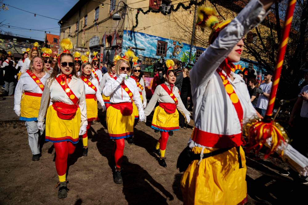 A women's band parades at Pusher Street, in Copenhagen, Denmark, on April 6, 2024, after residents of the Christiania neighbourhood dug up cobblestones to officially mark the closure of the street. Copenhagen's libertarian Christiana neighbourhood, an old hippie paradise tainted in recent years by drug trafficking violence, is clearing out its famous Pusher Street, where cannabis used to be sold freely. In late August, the so-called Christianite residents decided to close the street, known for its hashish stalls, after the fourth murder in three years shattered the image of a free-spirited and peaceful community. (Photo by Ida Marie Odgaard / Ritzau Scanpix / AFP)