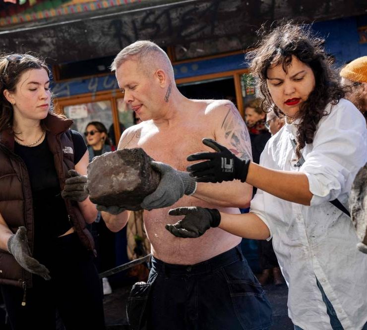 Residents of the Christiania neighbourhood pass on a cobblestone dug up at Pusher Street, in Copenhagen, Denmark, on April 6, 2024, as they mark the official closure of the street. Copenhagen's libertarian Christiana neighbourhood, an old hippie paradise tainted in recent years by drug trafficking violence, is clearing out its famous Pusher Street, where cannabis used to be sold freely. In late August, the so-called Christianite residents decided to close the street, known for its hashish stalls, after the fourth murder in three years shattered the image of a free-spirited and peaceful community. (Photo by Ida Marie Odgaard / Ritzau Scanpix / AFP)
