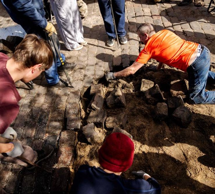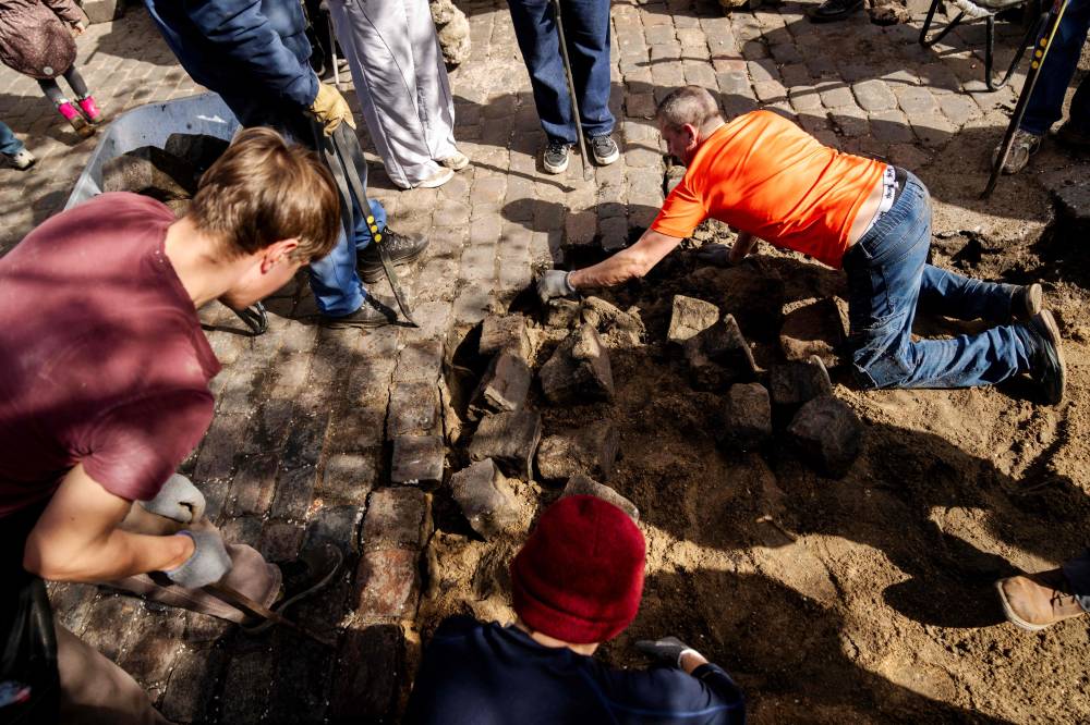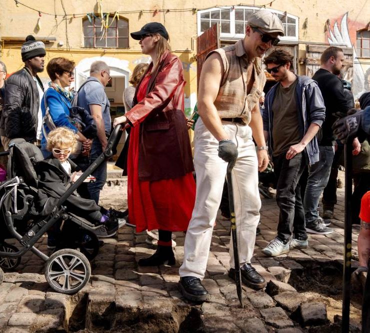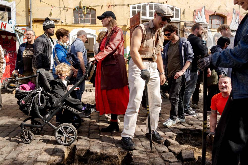 Residents of the Christiania neighbourhood jointly dig up the cobblestones at Pusher Street, in Copenhagen, Denmark, on April 6, 2024, to officially mark the closure of the street. Copenhagen's libertarian Christiana neighbourhood, an old hippie paradise tainted in recent years by drug trafficking violence, is clearing out its famous Pusher Street, where cannabis used to be sold freely. In late August, the so-called Christianite residents decided to close the street, known for its hashish stalls, after the fourth murder in three years shattered the image of a free-spirited and peaceful community. (Photo by Ida Marie Odgaard / Ritzau Scanpix / AFP)