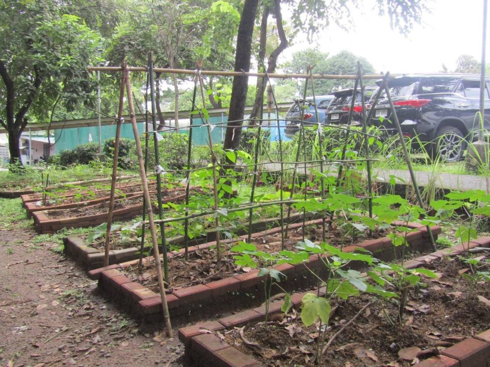 In the course of their work, the volunteer students saw the little rainbow they made when watering the plants. They observed eggplants growing on the branches of the plant, and insects and birds moving everywhere. The trees, meanwhile, provided them cool air and shade for rest.