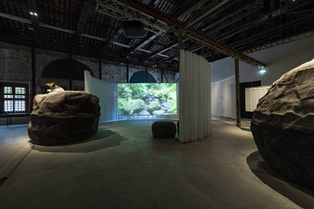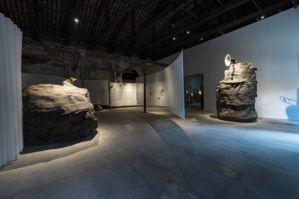 Similarly, this year’s exhibit at the Philippine Pavilion aims not to categorically define what “Filipino” is, but to build upon and contribute to the archipelago’s continually developing national identity.Salvatus based the installation on his Mt. Banahaw research, picking up where his late grandfather left off and using personal archives, including his family’s photographs, experiences and stories. He is friends with one of the musicians from the marching bands of Lucban, whose actual instruments have been fused to the gigantic boulder islands strewn across the dimly lit room. A section of printed fabric features the topography of all revolutions that have happened since his birth year. His son Yoji even appears in the video.