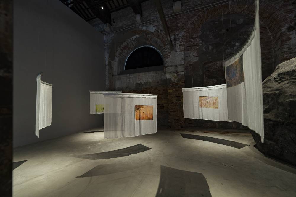 The second is the textile work, with the ethereal curtains shepherding guests through the gritty space. “The entirety of the exhibition encourages you to walk around,” Quijon added.