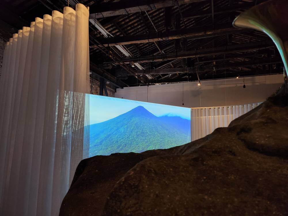 The first is the video work, which immediately catches the eye through the translucent curtains that define the space. It depicts various scenes including Mt. Banahaw, for which they have collaborated with brass musicians.