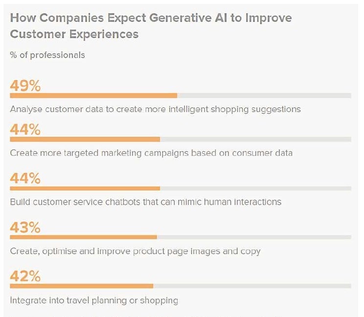 In fact, the report further states that 53 percent of professionals said their company plans to invest in generative AI over the next five years. These companies expect the technology to 1) analyze customer data to create more intelligent shopping suggestions (49 percent); 2) create more targeted marketing campaigns based on consumer data (44 percent); and 3) build customer service chatbots that can mimic human interactions (44 percent).