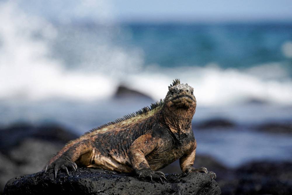 A marine iguana sits on a rock in front of the Pacific Ocean on Santa Cruz Island, part of the Galapagos Islands, Ecuador. Picture taken January 16, 2022. REUTERS/Santiago Arcos