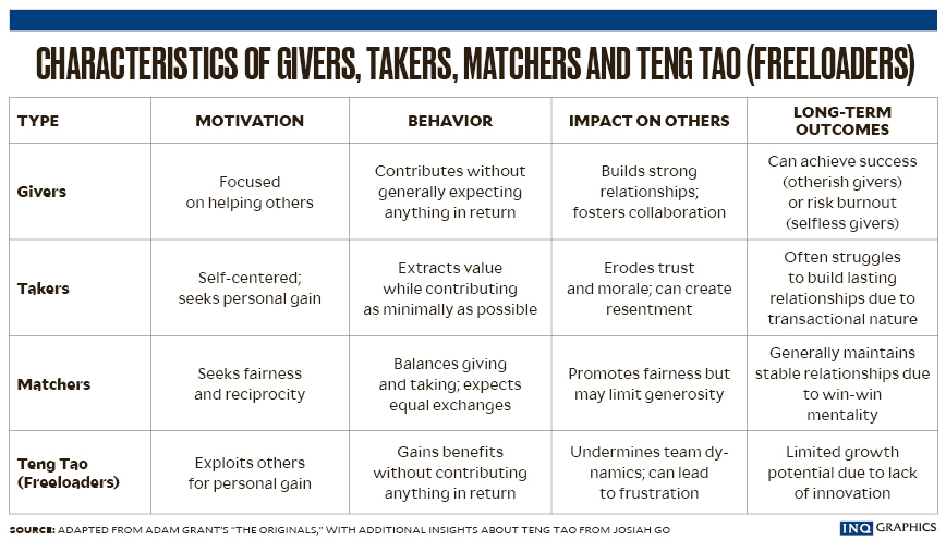Humans naturally possess a tendency to reciprocate, but givers, takers and even teng tao exemplify the extremes of this behavior. Givers who are strategic in their generosity, often referred to as “otherish givers,” stand in contrast to selfless givers. They possess the ability to navigate interactions with takers and matchers effectively, ensuring that they are not taken advantage of. This smart mindset allows them to maintain healthy relationships while still contributing positively to their organizations.
