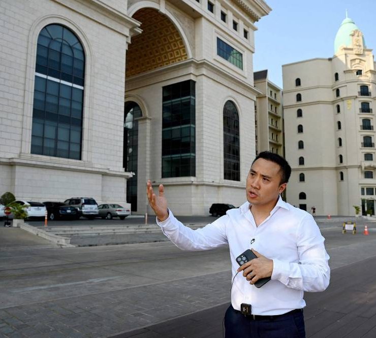 This photo taken on March 1, 2024 shows Thierry Tea, vice president of the Overseas Cambodian Investment Corporation (OCIC) group, speaking during an interview by the Elysee Commercial Center building in the Paris-style development along the Bassac river in the satellite city of Koh Pich in Phnom Penh. In downtown Phnom Penh, a huge high-end development mimicking the buildings and boulevards of Paris embodies a move to cash in on the "new frontier" for luxury -- in the capital of one of Asia's poorest countries. (Photo by TANG CHHIN Sothy / AFP) / To go with 'CAMBODIA-SOCIAL-LUXURY-CONSTRUCTION,FOCUS' by Alexis HONTANG and Suy SE