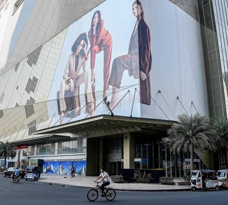 This photo taken on February 27, 2024 shows a man riding his bicycle past The Peak building with a large advertising billboard in Phnom Penh. In downtown Phnom Penh, a huge high-end development mimicking the buildings and boulevards of Paris embodies a move to cash in on the "new frontier" for luxury -- in the capital of one of Asia's poorest countries. (Photo by TANG CHHIN Sothy / AFP) / To go with 'CAMBODIA-SOCIAL-LUXURY-CONSTRUCTION,FOCUS' by Alexis HONTANG and Suy SE