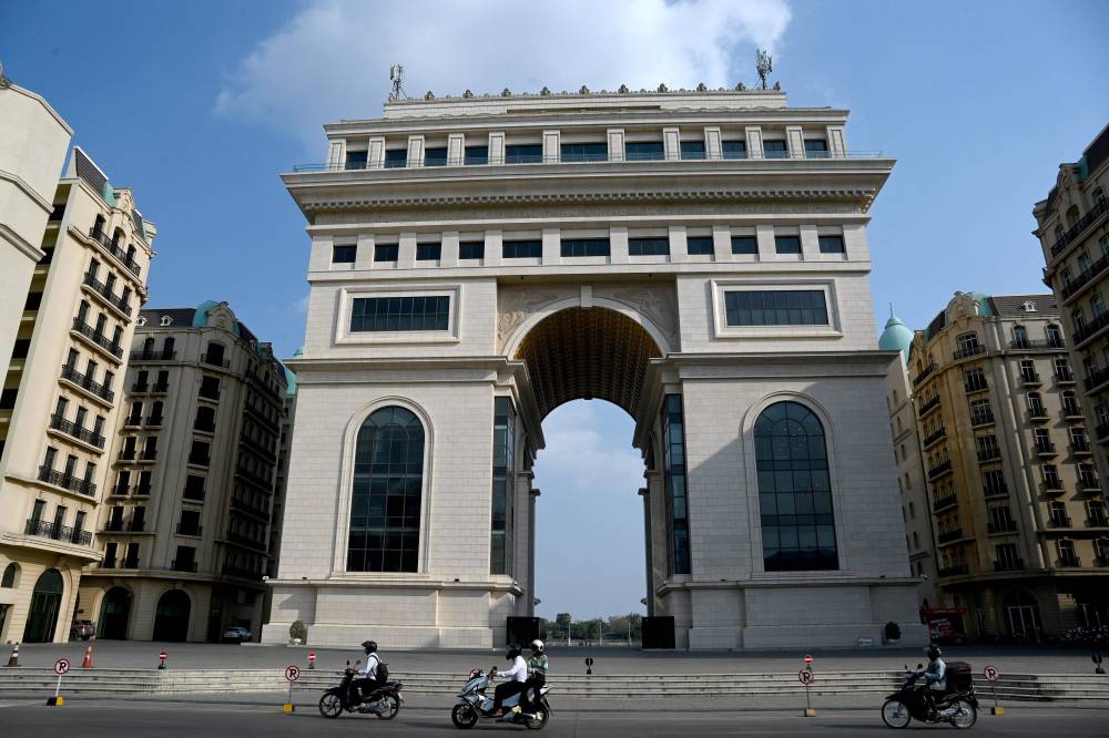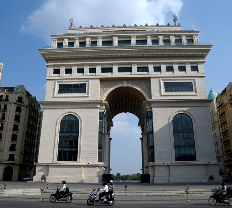 A replica of the Arc de Triomphe towers over a branch of the Mekong River, flanked by shops and apartments built in the style of the French capital’s signature Haussmann blocs.
