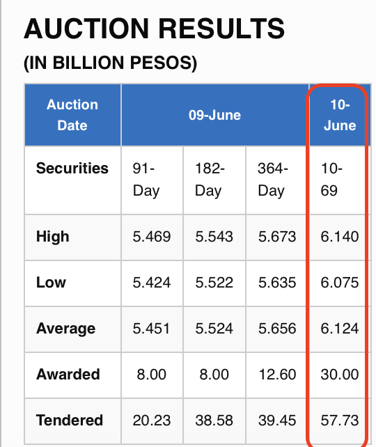 Auction results showed the offering attracted P57.7 billion in total bids, exceeding the original size of the issuance by 1.9 times.