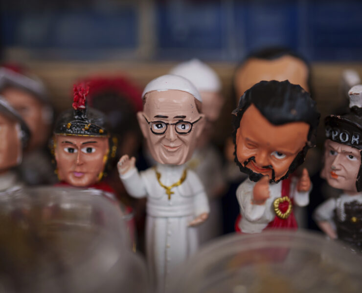 Pope Francis sits upright in an armchair as Argentines in Rome pray for his recovery