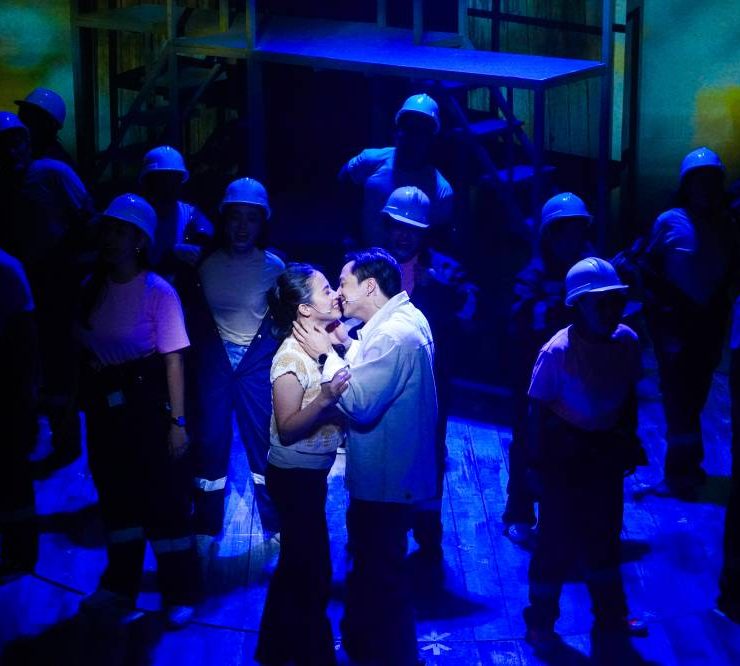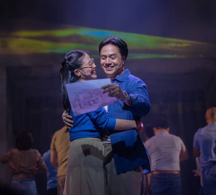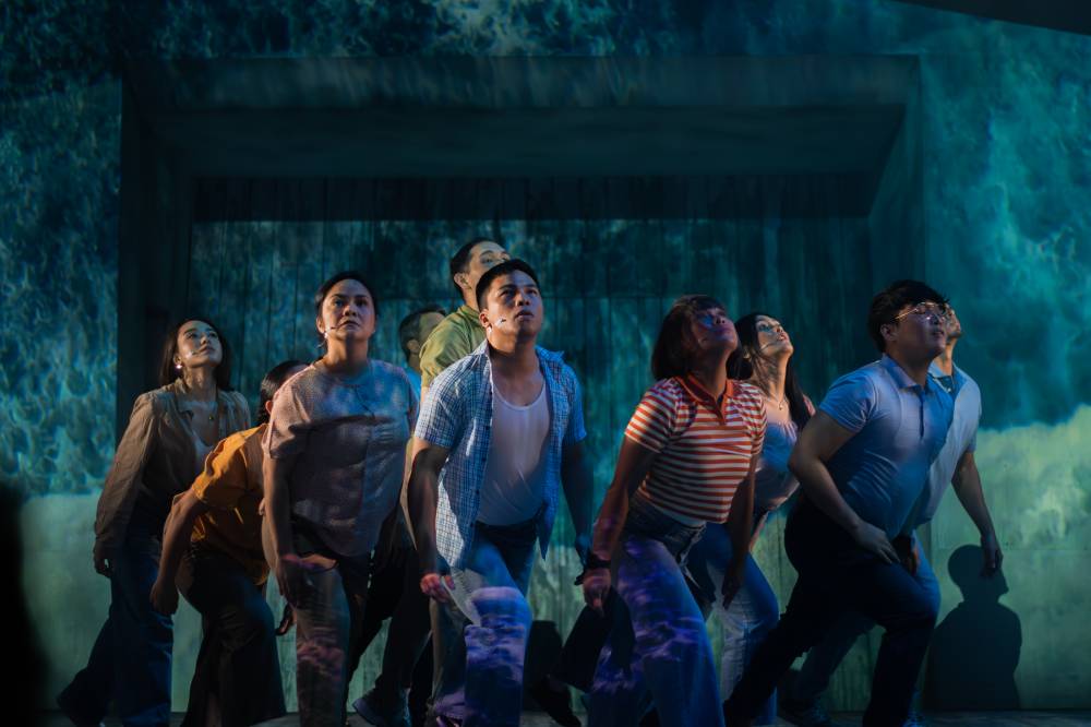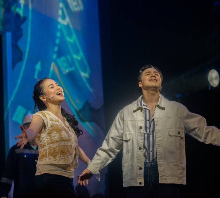 As we settled into our seats and the house lights were dimmed, ocean sounds started playing. Projected on the proscenium was a bird’s-eye view of waves washing over white sand. Cast members helped set the scene before actors Sam Concepcion (Popoy) and Anna Luna (Basha) came onstage, twinning in denim and brimming with love for one another.