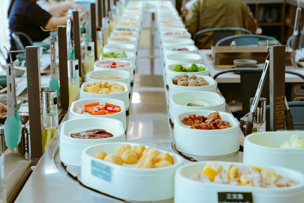 With futuristic blue and white interiors and slow-moving conveyor belts that bear different hotpot toppings—from noodles to seafood balls, actual seafood (crab and shrimp, for example), meat, vegetables, mushrooms, tofu, and even unexpected ingredients like blood cubes, pig liver, or smoked duck breast.