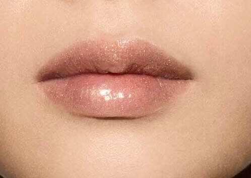 The shade $uperfine Suga leans more topper than standalone color. With its clear, slightly milky base threaded with fine gold crystalline glitter, it layers beautifully over bare lips or lipstick, adding dimension rather than color.
