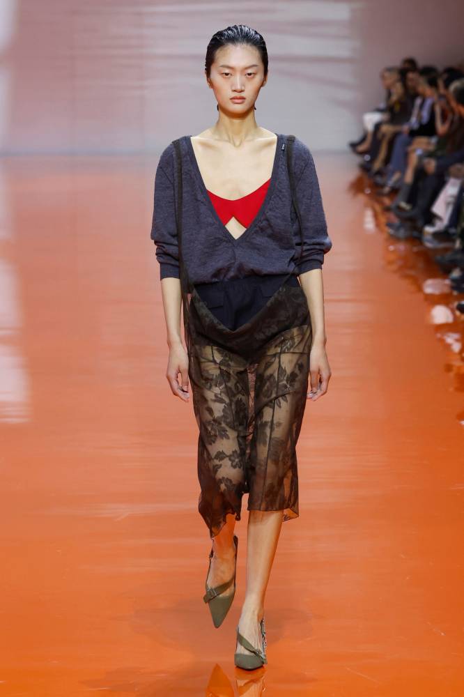 Layering continued with cropped sweaters and tops styled over long undershirts, as seen at Jil Sander. The contrast in proportions—short over long, fitted over fluid—created an understated tension that felt clean, modern, and quietly intellectual.