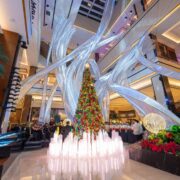 These simple yet effective interventions and a sophisticated color palette of black, white, and gray provided the perfect canvas for the addition of glam elements. A harmonious blend of texture and shine elevated the room’s ambiance. Mirrored columns, metallic accessories, and plush upholstery introduced visual interest. The mirrored surfaces amplified the reflection of Jinggoy Buensuceso’s black origami wall sculpture and the sculptural light above the dining area.