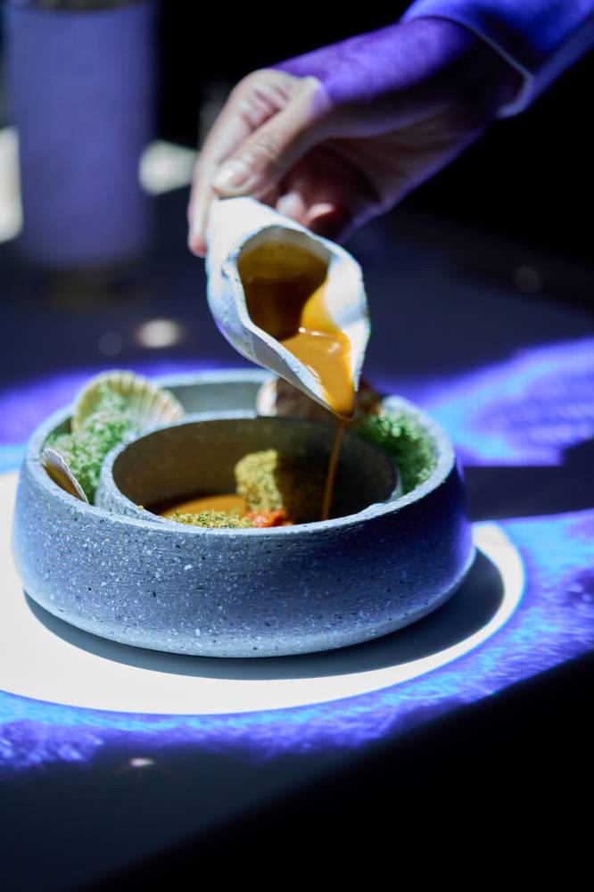 Each dish is an interactive chapter. The evening unfolds over five courses, each one moving the story forward. The table responds—projections shift, questions are asked, and little surprises appear. You’re not just watching, you’re a part of it.