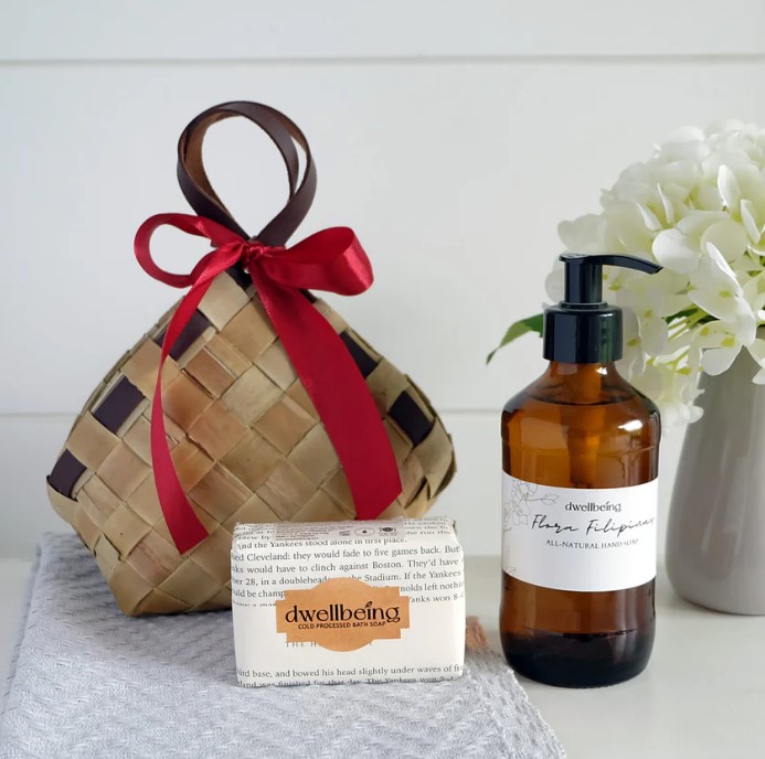 A generous six-piece bundle made for effortless gifting, this basket bag includes Dwellbeing favorites: a melted bottle cheese tray, handcrafted soap bar, inabel hand towel, Everything Clean sanitizer, and a lemongrass liquid hand soap.