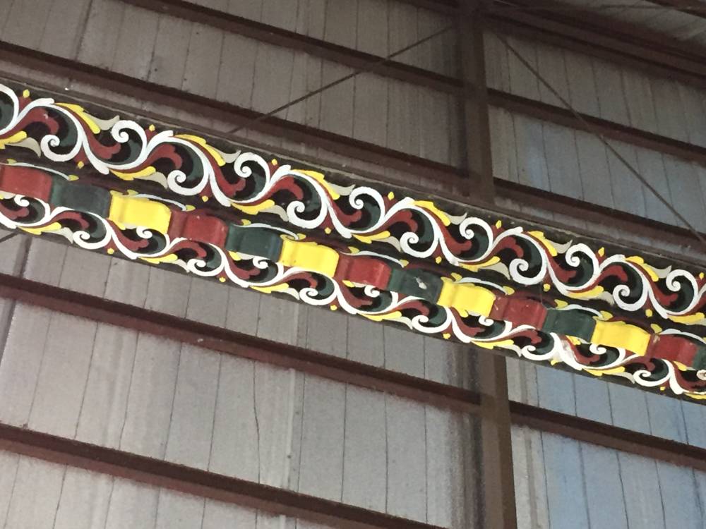 All designed in okir, the panolong are carved with pako rabong (fern) or naga (serpent) motif, while the beams are polychromed with Maranao traditional colors of green, yellow, red, and white.