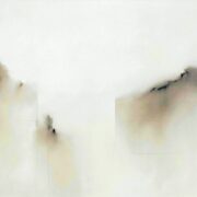 Diverting from the familiar watery reflections that permeate most watercolor works, Mendoza prefers feasting on the myriad delights and pleasures of patterning and linear configurations. The undulating motion of the water evokes her waves, transforming them into a crackle of mosaics. Her fishermen are mending their fishnets, which look like fine slivers of silver filament threading their way into their hands. From a bird’s-eye view, her sand transforms into a veritable raking of curvilinear lines, creating a strange shore. Indeed, one can wistfully view many of Mendoza’s works from the sky or a mountaintop. The finely calculated lines glide and ripple across the paper surface, weaving into an aquatic abstraction.