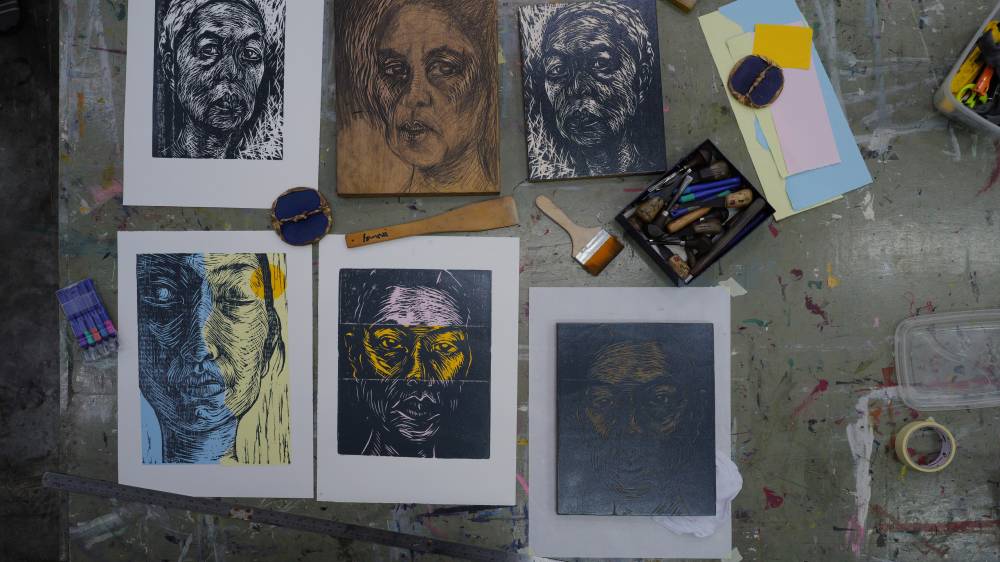 Nearby, Ambie Abaño’s woodcuts turn inward through repeated self-portraits, meditations on the soul shaped by the resistance of wood grain and the passage of time. For the fair, she also incorporates fabric into her works.