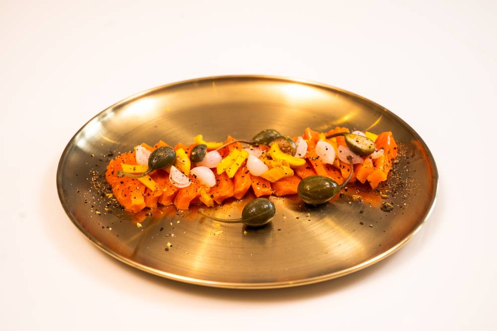 2. Assemble on chilled plates. Arrange salmon neatly on a cold plate—scatter dried mango, pickled onions, and capers evenly over the top.