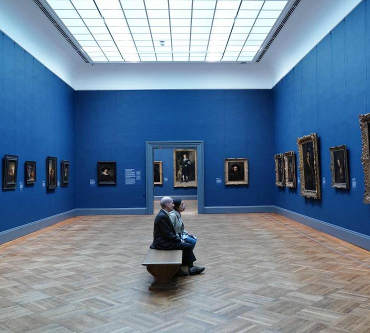 A couple sits in a gallery exhibiting paintings by Rembrandt during a press preview at The Metropolitan Museum of Art in New York on November 16, 2023. Five centuries of European painting can be seen in a new light starting November 20, thanks to a five-year, $150 million renovation at New York's Metropolitan Museum of Art. The bold redo of the museum's massive wing devoted to masters from the 14th to 19th century includes a range of improvements, including to the section's skylights. (Photo by Bryan R. Smith / AFP)
