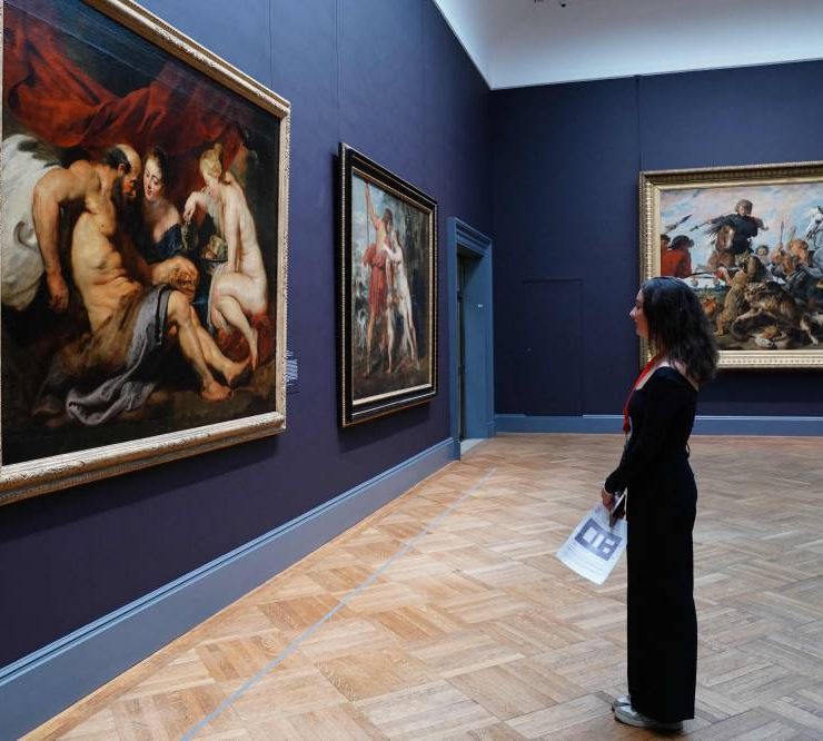 A visitor looks over Peter Paul Reubens painting Lot and His Daughters, ca. 1613, during a press preview at The Metropolitan Museum of Art in New York on November 16, 2023. Five centuries of European painting can be seen in a new light starting November 20, thanks to a five-year, $150 million renovation at New York's Metropolitan Museum of Art. The bold redo of the museum's massive wing devoted to masters from the 14th to 19th century includes a range of improvements, including to the section's skylights. (Photo by Bryan R. Smith / AFP)
