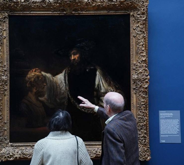 A couple looks over Rembrandt's painting Aristotle with a Bust of Homer, 1653, during a press preview at The Metropolitan Museum of Art in New York on November 16, 2023. Five centuries of European painting can be seen in a new light starting November 20, thanks to a five-year, $150 million renovation at New York's Metropolitan Museum of Art. The bold redo of the museum's massive wing devoted to masters from the 14th to 19th century includes a range of improvements, including to the section's skylights. (Photo by Bryan R. Smith / AFP)