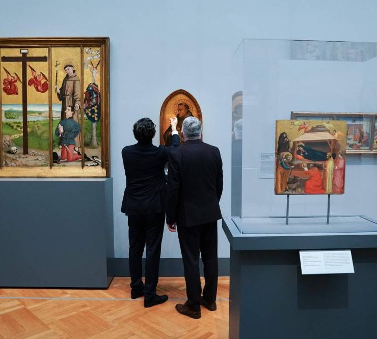Visitors look over Saint Anthony of Padua, ca. 1340, by Maso di Banco, during a press preview at The Metropolitan Museum of Art in New York on November 16, 2023. Five centuries of European painting can be seen in a new light starting November 20, thanks to a five-year, $150 million renovation at New York's Metropolitan Museum of Art. The bold redo of the museum's massive wing devoted to masters from the 14th to 19th century includes a range of improvements, including to the section's skylights. (Photo by Bryan R. Smith / AFP)