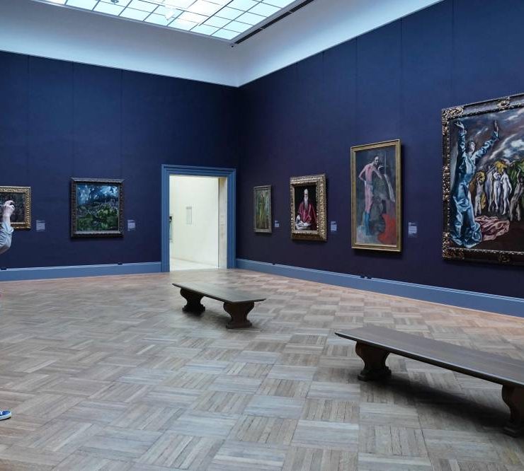 A visitor takes a photo of paintings by Picasso and El Greco during a press preview at The Metropolitan Museum of Art in New York on November 16, 2023. Five centuries of European painting can be seen in a new light starting November 20, thanks to a five-year, $150 million renovation at New York's Metropolitan Museum of Art. The bold redo of the museum's massive wing devoted to masters from the 14th to 19th century includes a range of improvements, including to the section's skylights. (Photo by Bryan R. Smith / AFP)