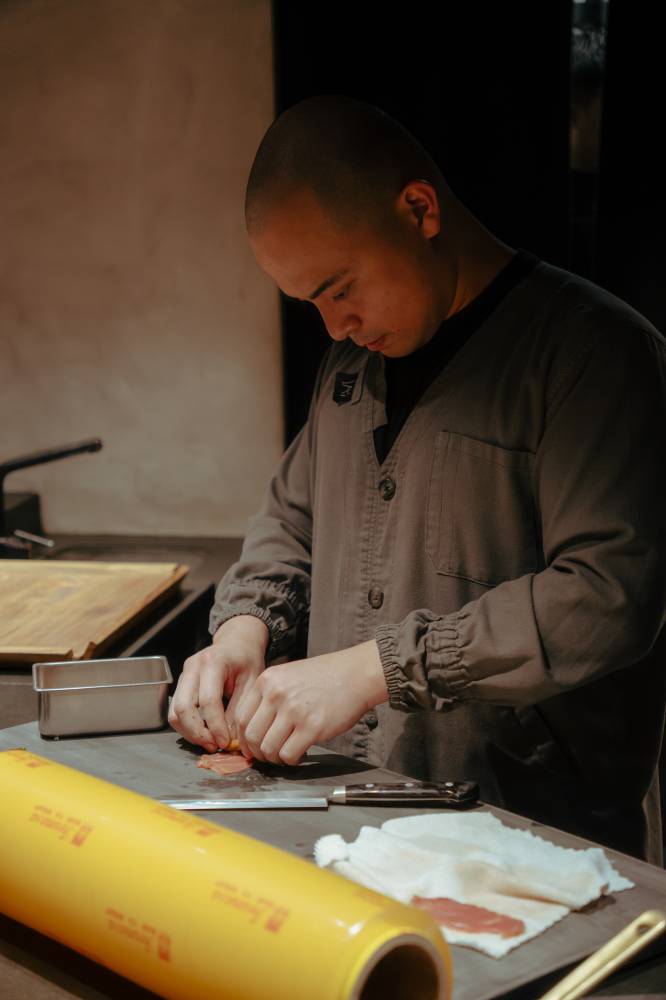 “Normally with this menu, you start off with a cold dish, [but] there’s a hot appetizer, a steamed course, a signature dish that’s been with me for a while, and then a token seafood item like toro or grilled fatty tuna,” Ricketts explains. “And then a meat dish that goes on rotation throughout the weeks, depending on what’s available and what’s ready as we’re aging it, drying it, and curing it—French quail, dry-aged duck from Hokkaido, aged beef. And then, dessert.”