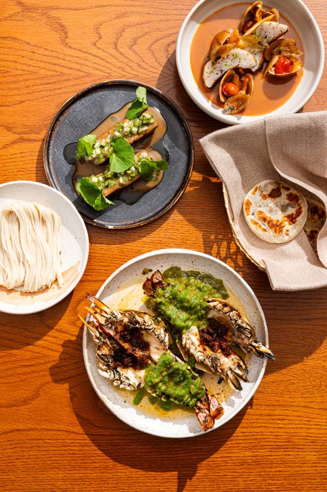 On subsequent dishes, the direction shifts into more explosive territory—bagaybay (fish sperm) mousse on a collaborative banh mi, there’s a spiced shrimp tartare with peanut butter, a noticeably Ayà take on inasal using mushroom, and an off-kilter goi cuon and lumpia mash presented taco-style with Margra lamb and a pig brain sauce that packs quite the punch. Elsewhere, grilled river prawns are resurrected on the table with green chili butter sauce purpose-made for savoring the crustacean from head to tail.
