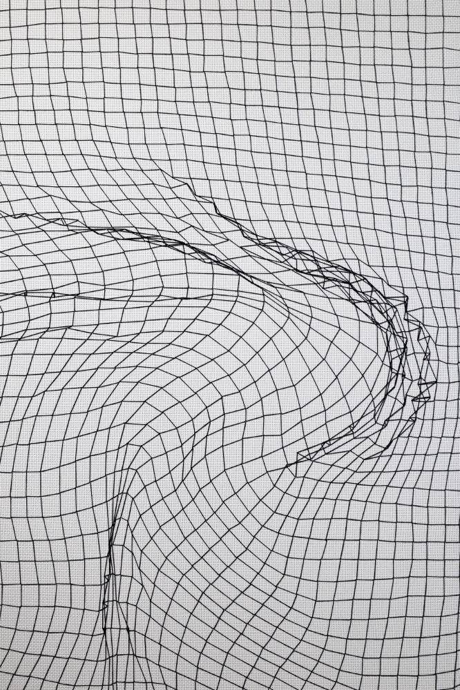 Eventually, the series of works on Aida cloth has solely relied on the wireframe imagery, generated through a 3D software called Blender. I think that “world-building” is innate in using such tools. So, combining the processes together to create embroidered pieces on Aida cloth adds to the ontological layer of the series itself. When did the image or form become “some thing”? Was it when the code displayed it on screen, or was it when I embroidered it?