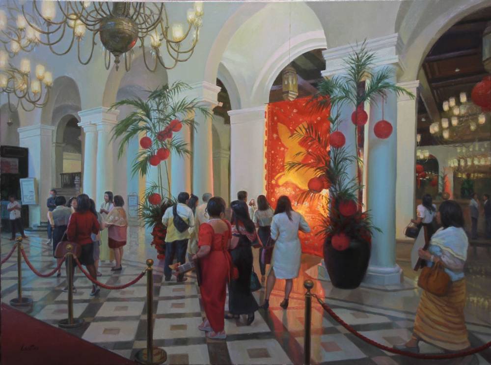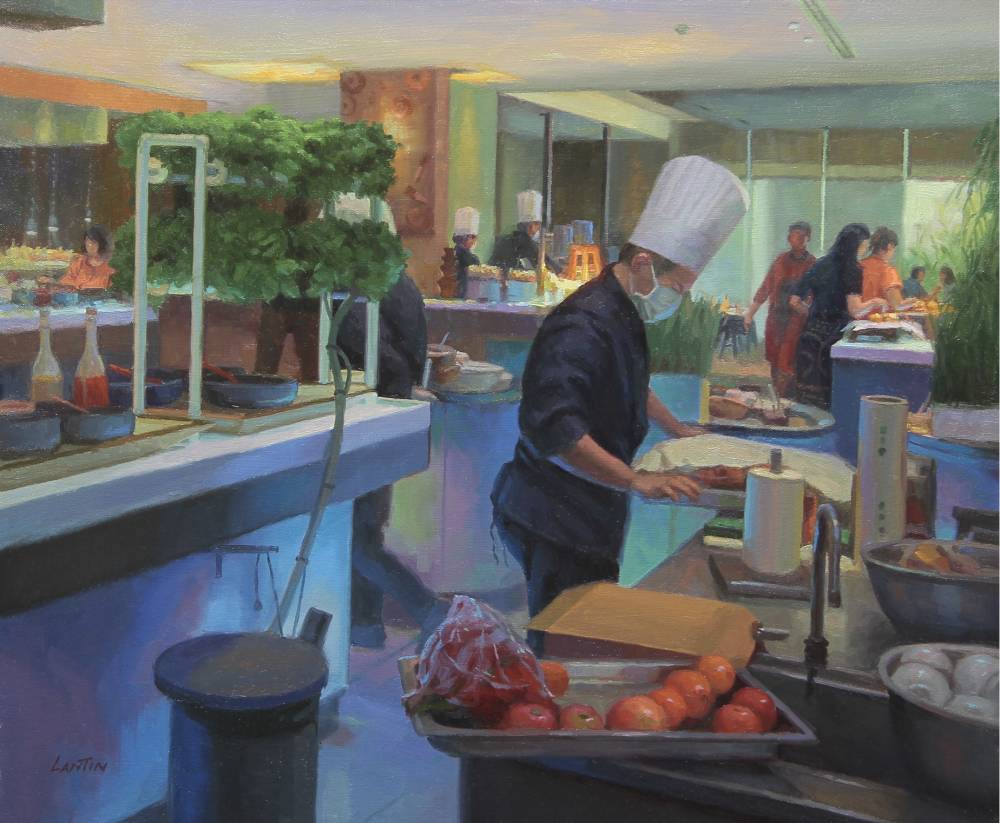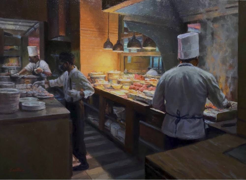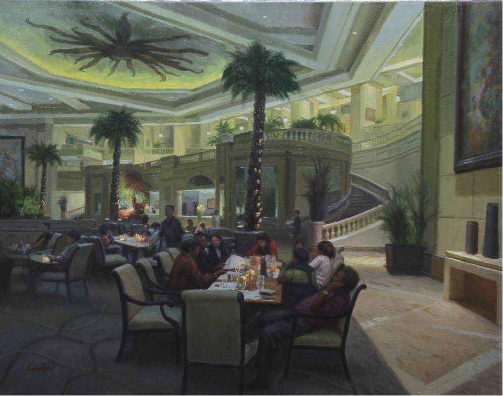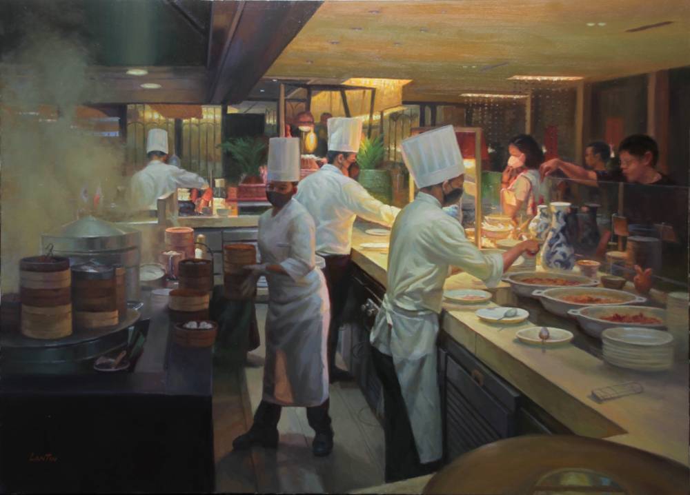 In this series, random interior scenes such as chefs preparing food, lobby guests, and diners are expressed in their true realist forms. Every detail is likewise captured, from architectural features, table set-up, to even the effect of light on the floor.