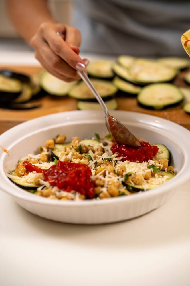 - Repeat until the components are all layered, making sure you end with a layer of tomato sauce and cheese on top.
