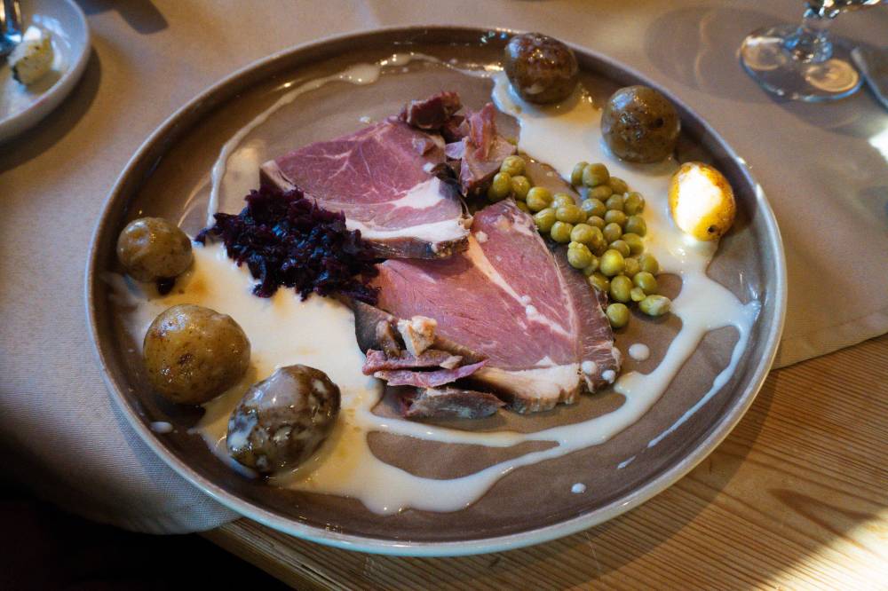 My favorite dish by far is hangikjöt, a delicacy enjoyed during Christmas. It’s cold cuts of cured lamb smoked over sheep dung due to wood’s historical scarcity in the country. This cooking method gives the lamb an incredible mix of smoky and fragrant flavors. After polishing off my hangikjöt, I had some rhubarb pie at Fjallakaffi, a café in the highlands.