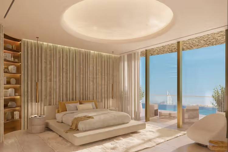 Designed by Maison Margiela in collaboration with Italian architect Carlo Colombo, the residences blend material experimentation with architectural mastery. Travertine, white resin, and the maison’s signature décortiqué technique converge in spaces that balance elegance and discretion. Each room is meticulously detailed—bathrooms wrapped in deep red marble that flows like silk, bedrooms dressed in soft layers of beige, gold, and ivory, with panoramic windows that look out the Arabian Gulf. Even in a city obsessed with grandeur, the residences redefine what high-end living can look—and feel—like.
