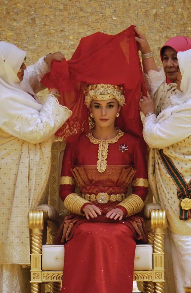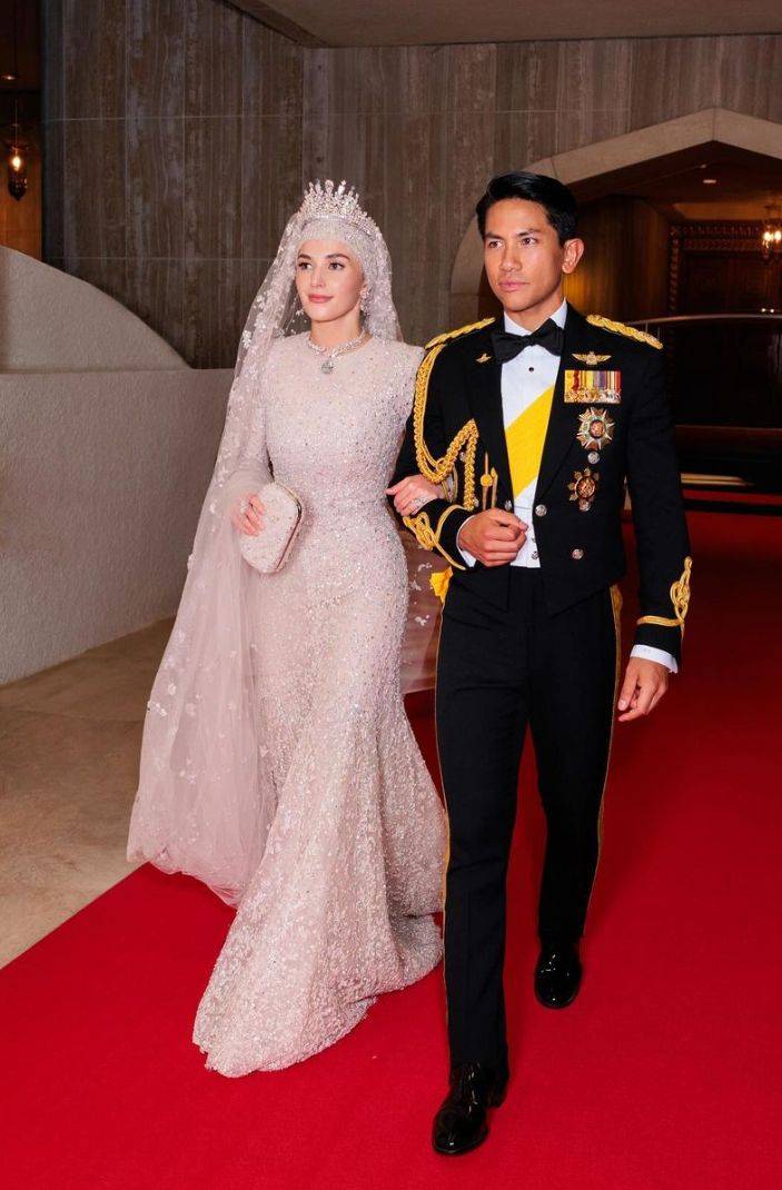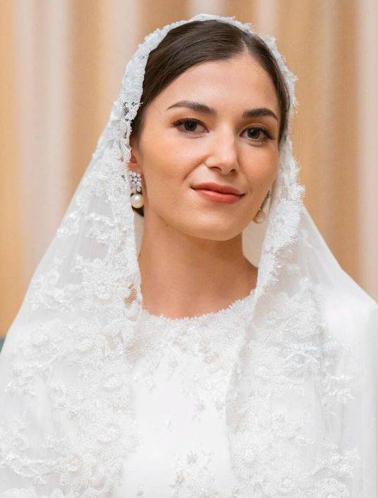 Over her heavily embroidered cathedral veil that also wrapped her hair, she wore a hand-me-down—she’s just like us!—diamond-encrusted tiara originally crafted by Singapore luxury jeweler Flower Diamond for the 2023 wedding of Mateen’s sister, Princess Azemah Ni’matul Bolkiah.