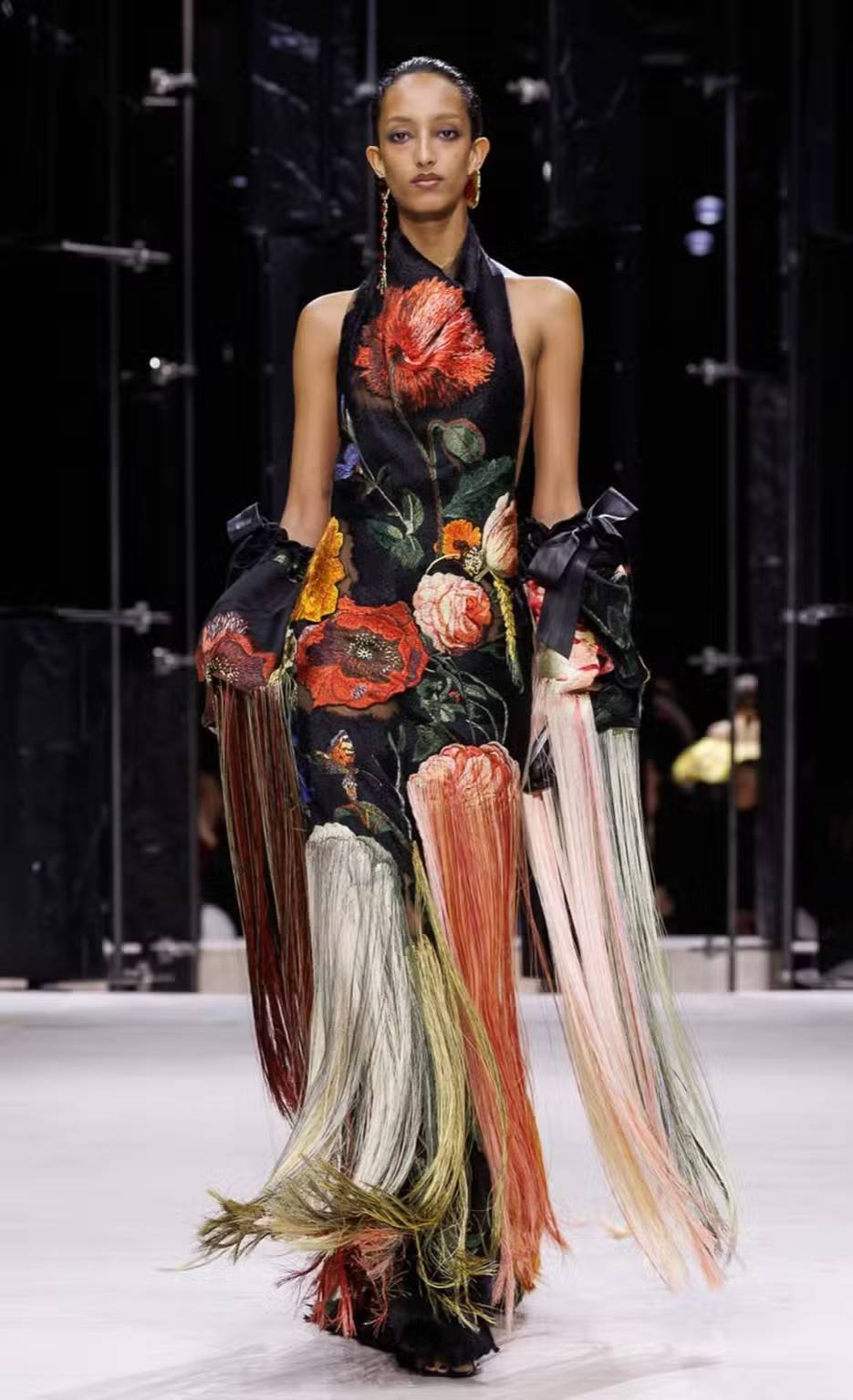 Modeled by Mona Tougaard, the dress features a high halter neckline over a dark, form-fitting base. From it flowed intricate floral embroidery, unraveling into dramatic, floor-sweeping fringes. These strands swished across Givenchy’s runway floor, echoing the dynamism of Ventura’s brushstrokes.
