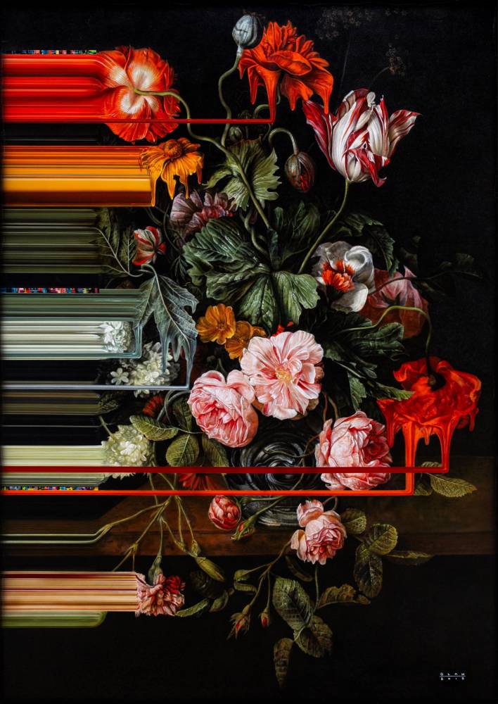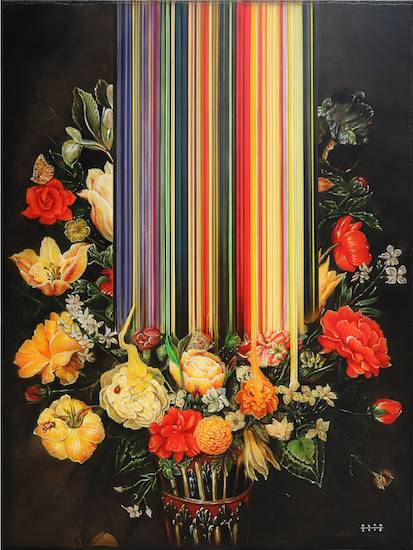You may know the ultra-contemporary artist for his process, blending painterly technique with digital distortion, often depicting overflowing flowers, fruits, or foliage, suddenly stretched or pulled like taffy into surreal linear forms. He has also exhibited globally at galleries such as Whitestone Gallery and Yavuz Gallery.