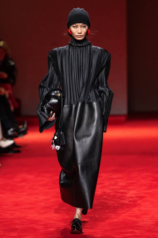 That translated to the coats, long jackets, and coat dresses with bold, exaggerated shoulders—”like armor,” Trotter said—some of them with an accompanying brown leather belt that dangled, sword-like, from the waist.