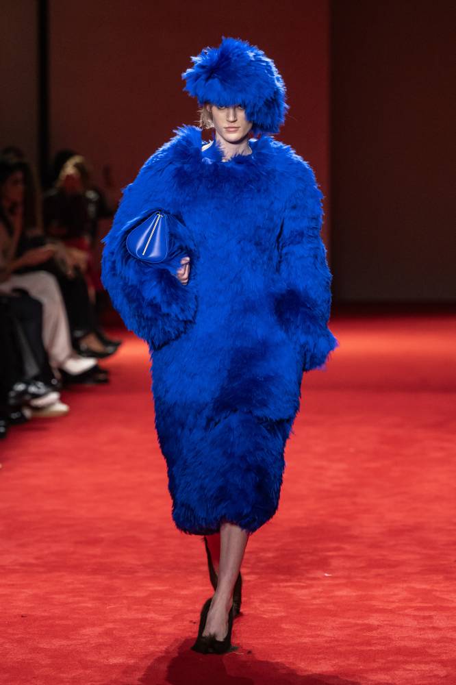 The costume-like poofs moved and shimmered under the lights of the former theater where the runway show was held, just steps from the La Scala opera, many of them paired with matching hats, in colors of electric blue, black, and bubblegum pink. Meanwhile, a sweater worn by a male model recalled a Harlequin theme with splotches of red and black against the white background of the shimmering, fur-like material.