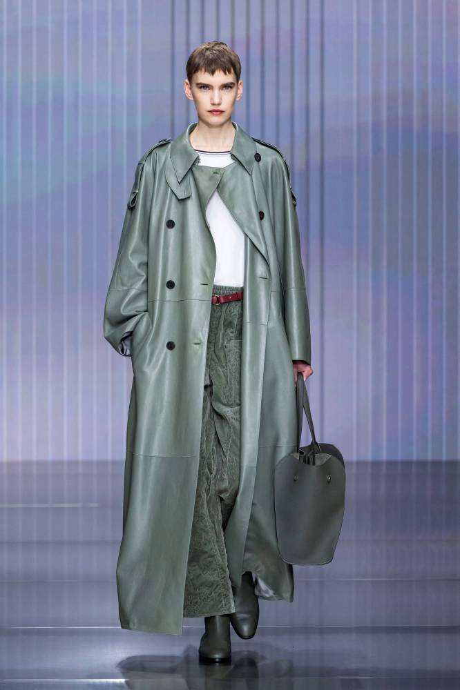 Milan’s most famous brand, Giorgio Armani, also channeled a Milanese mood on Sunday, but more contemplative in a collection that drew on Japanese influences and hues of blue-gray and claret.